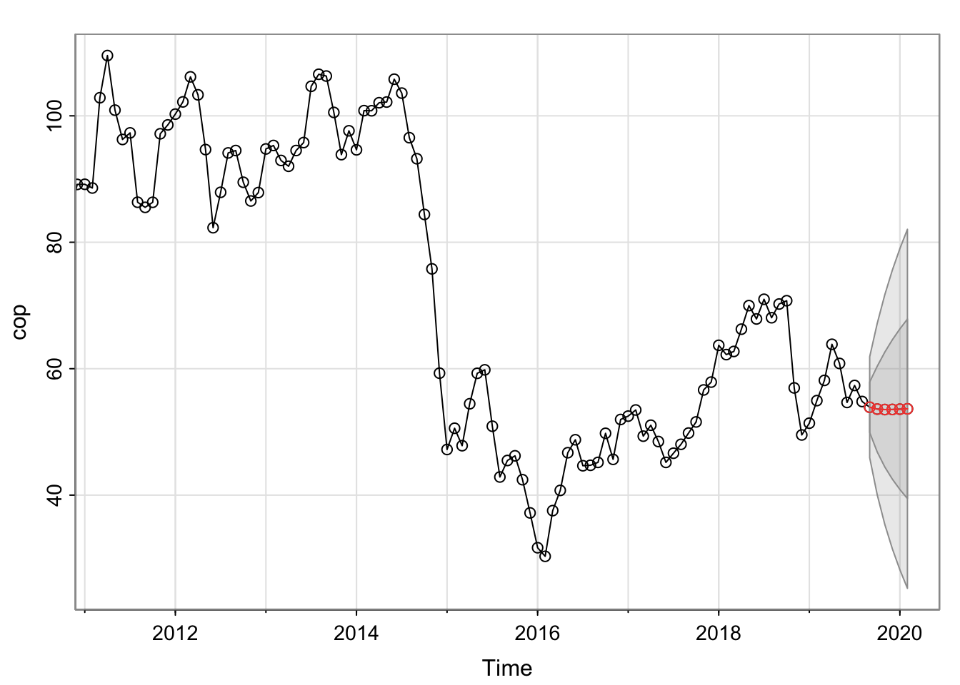 oil_for <- sarima.for(cop, n.ahead = 6, 1,1,0)