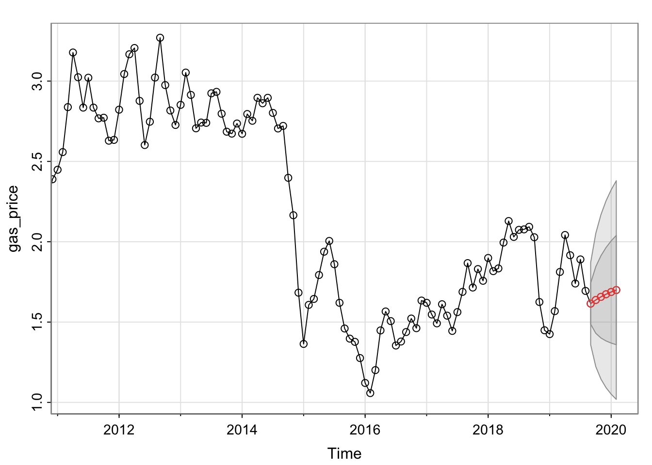 sarima.for(gas_price, 1,1,2, n.ahead = 6)