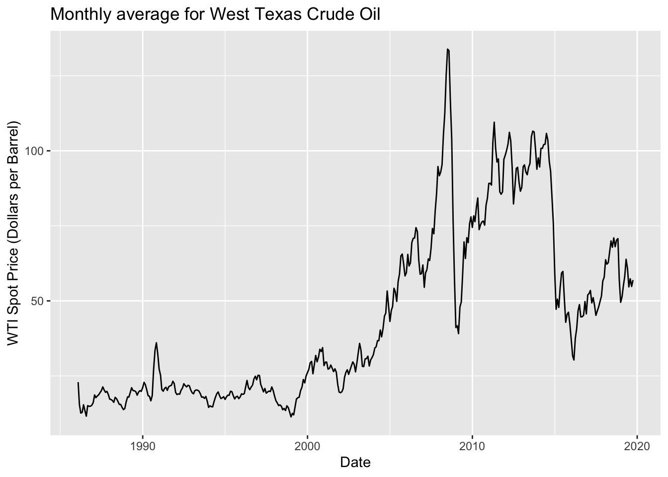 geom_line() + ylab("WTI Spot Price (Dollars per Barrel)") + xlab("Date") + ggtitle("Monthly average for West Texas Crude Oil")
